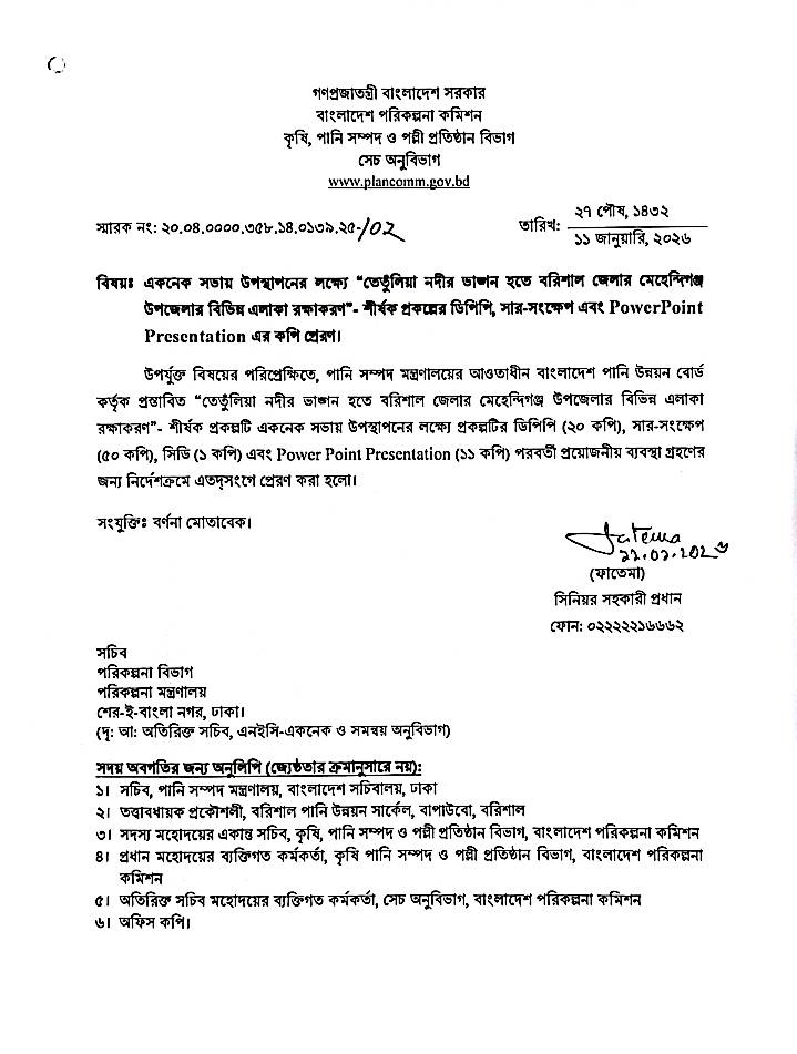 বাংলাদেশ পরিকল্পনা কমিশনের কৃষি, পানি সম্পদ ও পল্লী প্রতিষ্ঠান বিভাগের উদ্যোগে “মেঘনা ও তেঁতুলিয়া নদীর ভাঙন হতে বরিশাল জেলার মেহেন্দিগঞ্জ উপজেলার বিভিন্ন এলাকা সংরক্ষণ” শীর্ষক প্রকল্পটি একনেক সভায় উপস্থাপনের লক্ষ্যে প্রয়োজনীয় প্রক্রিয়া সম্পন্ন করা হয়েছে। এ সংক্রান্ত ডিপিপি, সার-সংক্ষেপ, সিডি এবং পাওয়ার পয়েন্ট প্রেজেন্টেশন ইতোমধ্যে সংশ্লিষ্ট মন্ত্রণালয় ও দপ্তরে প্রেরণ করা হয়েছে।