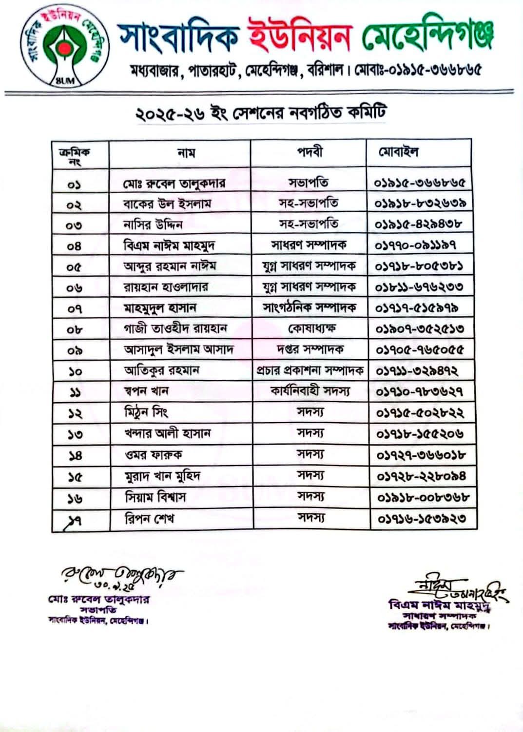 ৩০ সেপ্টেম্বর ২০২৫ইং, রোজ মঙ্গলবার গঠিত হয় সাংবাদিক ইউনিয়ন মেহেন্দিগঞ্জ এর নবগঠিত কমিটি।
