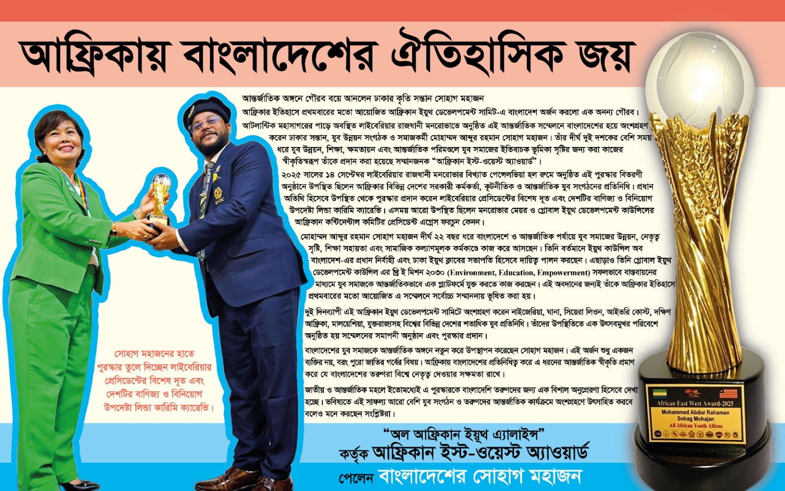 আন্তর্জাতিক অঙ্গনে গৌরব বয়ে আনলেন ঢাকার কৃতি সন্তান সোহাগ মহাজন আফ্রিকার ইতিহাসে প্রথমবারের মতো আয়োজিত আফ্রিকান ইয়ুথ