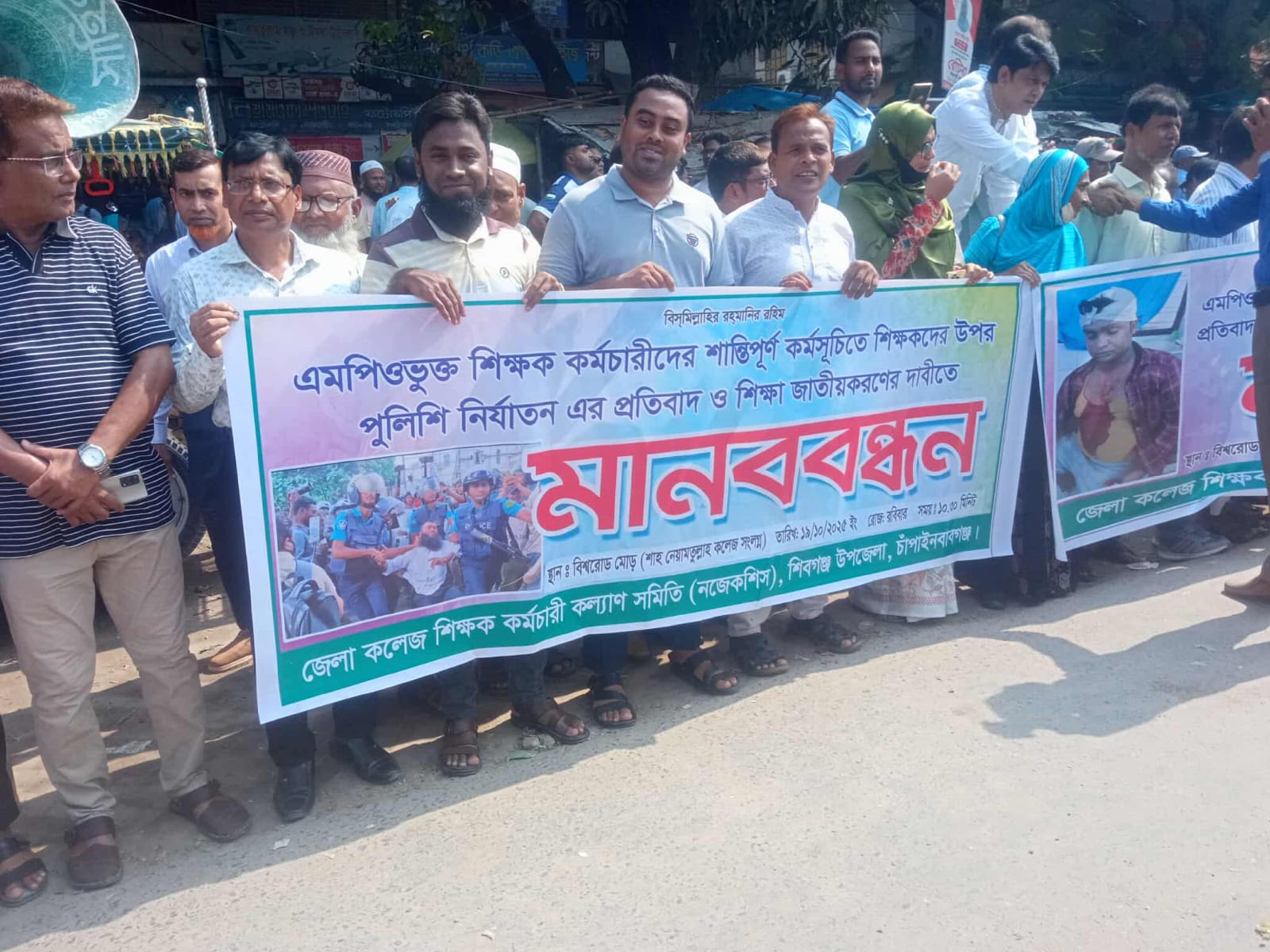 চাঁপাইনবাবগঞ্জে শিক্ষা জাতীয়করণের দাবিতে ও শিক্ষকদের ওপর পুলিশি নির্যাতনের প্রতিবাদে মানববন্ধন